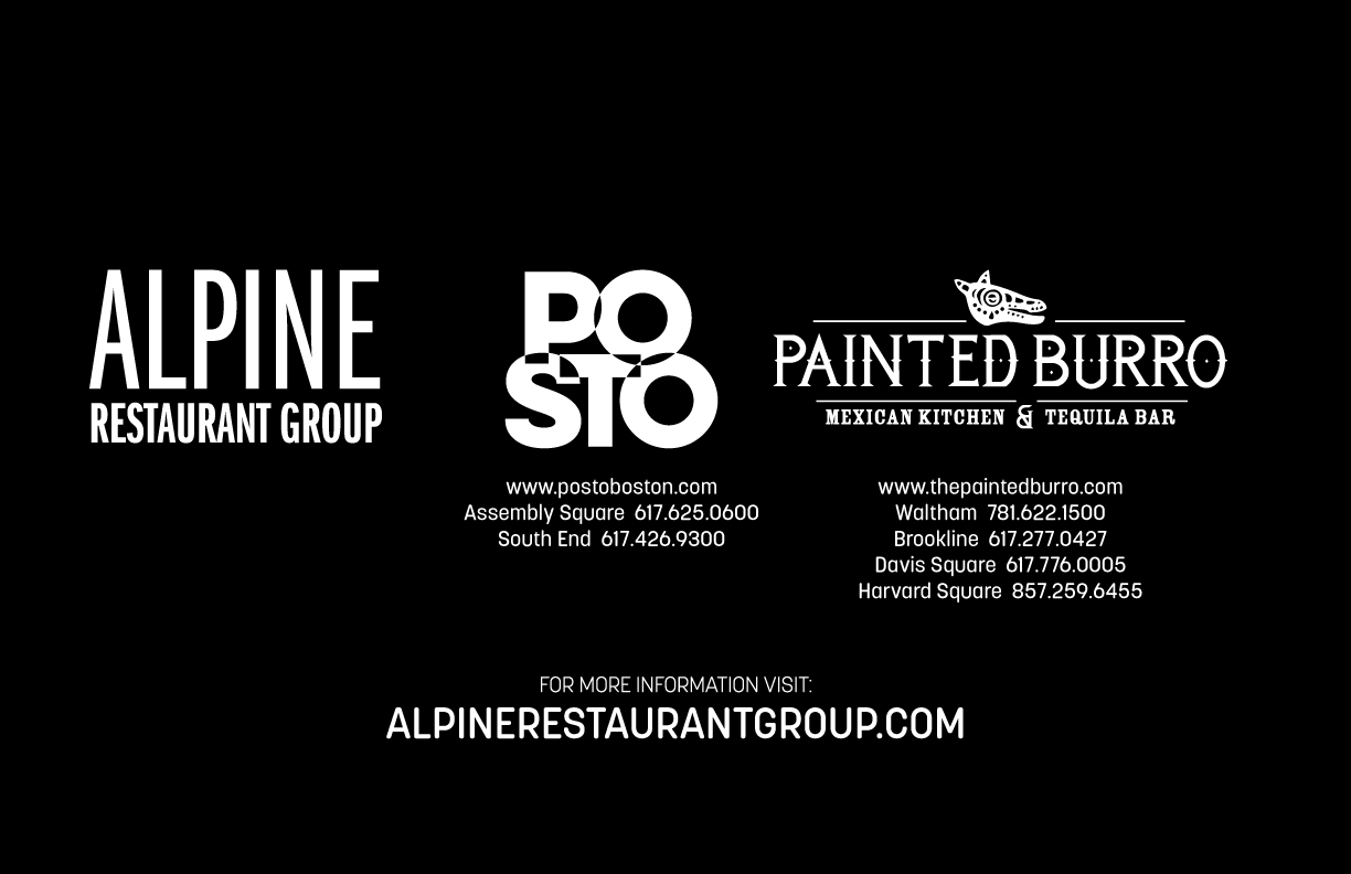 Posto (Assembly Row + South End) and The Painted Burro (Harvard Square, Davis Square, Waltham + Brookline) are all part of the Alpine Restaurant Group and accept this great gift!