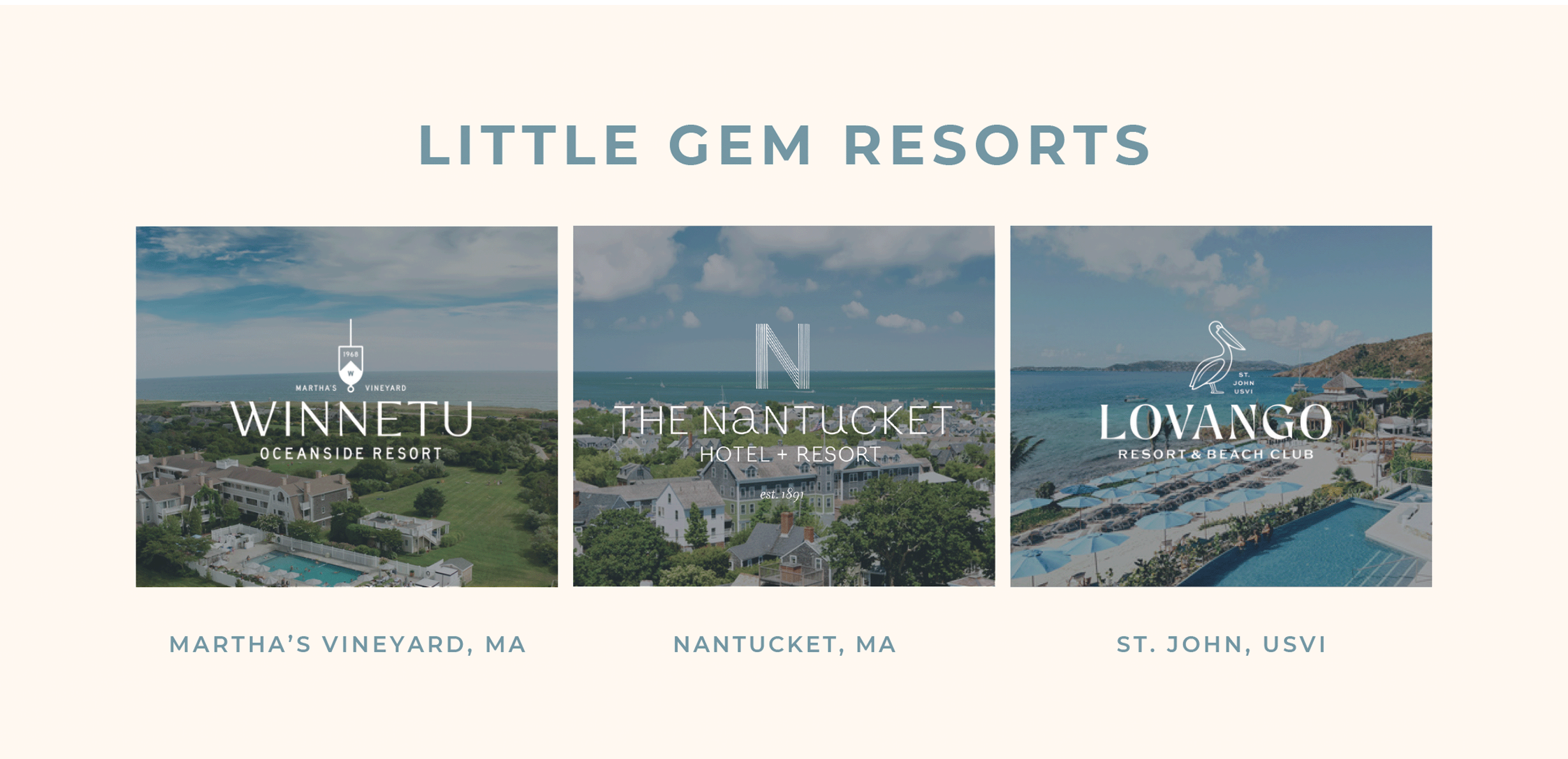 Little Gem Resorts (LGR)is a family-owned collection of boutique resorts located on the iconic islands of Martha’s Vineyard, Nantucket, and St John USVI. Guests connect to each enchanting destination with a rare and glorious mix of relaxation and adventure.